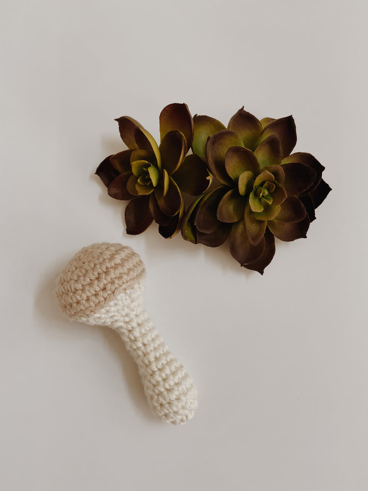 This unique little handmade mushroom has a rattle inside for hours of entertainment!