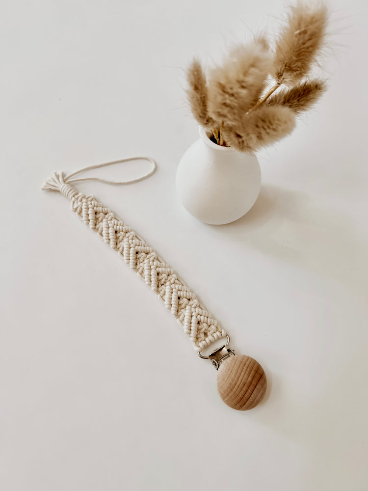 Secure your baby's pacifier in style with our Macrame Pacifier Clip. Made with high-quality materials, this pacifier clip will keep your baby's pacifier within reach and away from dirty floors. Say goodbye to constantly picking up dropped pacifiers and hello to convenience and peace of mind.