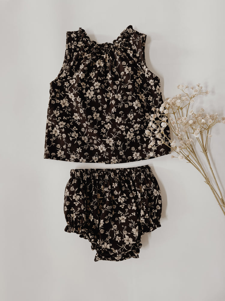 A beautifully coordinated top and bloomer designed for your little love. Featuring a soft black base with delicate neutral florals, this timeless print brings a vintage inspired charm to everyday moments and special occasions alike.