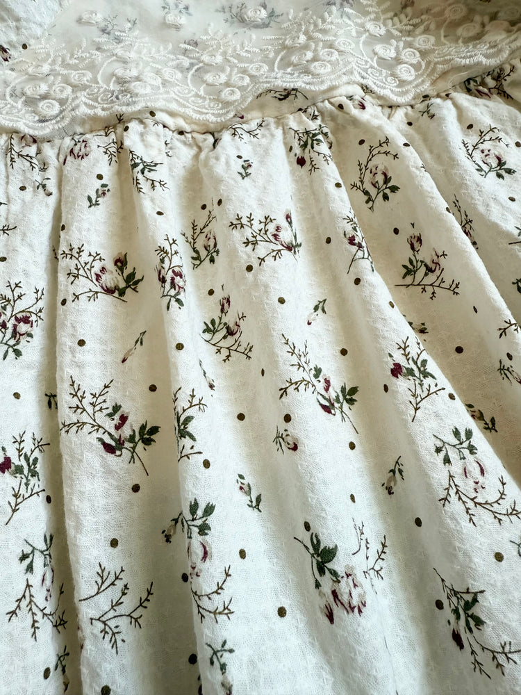 This infant romper features an elegant floral pattern complemented by delicate lace detailing, combining classic charm with refined style. Soft and comfortable for baby's sensitive skin, it offers both ease of movement and a sophisticated look perfect for special occasions or everyday wear.