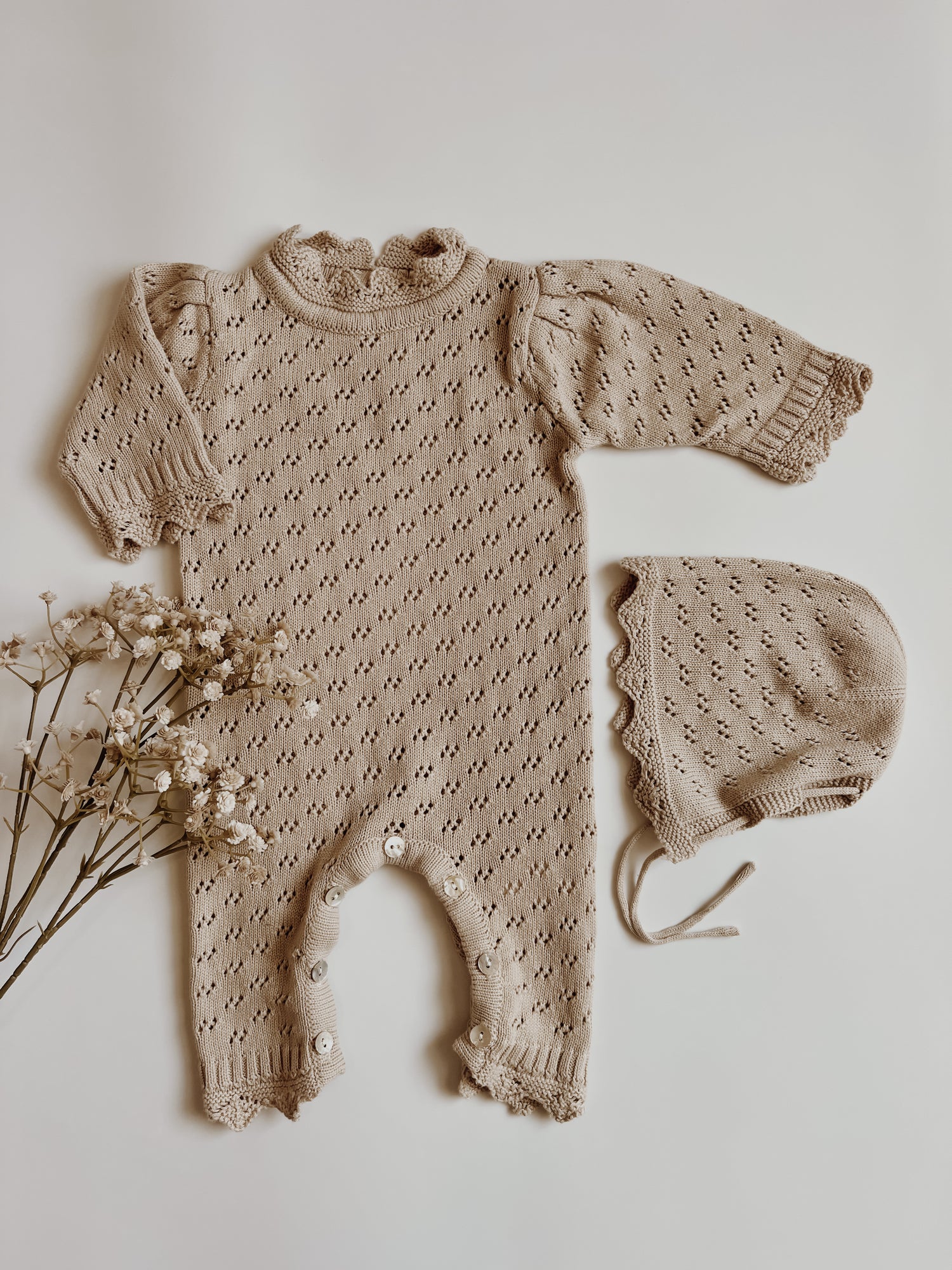 Wrap your little one in luxury with our Knit Set featuring a delicate bonnet. Made with the softest knit, this set is not only stylish but also keeps your baby warm and comfortable. Perfect for those special occasions, it's a must-have for any elegant wardrobe.