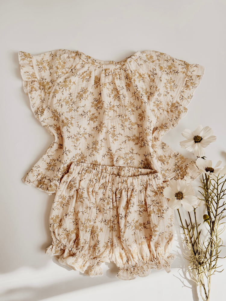 Introducing the Dorothy Set - a playful and vintage-inspired outfit for your little one. Made from soft muslin fabric, this infant set is perfect for both everyday wear and special occasions. Bring some fun into your child's wardrobe with this unique set.