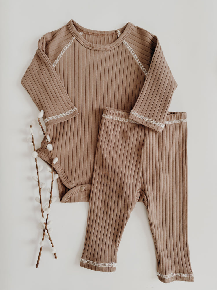 Introducing the Kaeson Ribbed Lounge Set in Chocolate - perfect for your little one's lounging needs. Made with soft and comfortable ribbed material, this set will keep your baby cozy and stylish. Great for playtime, it's an essential addition to any baby's wardrobe.
